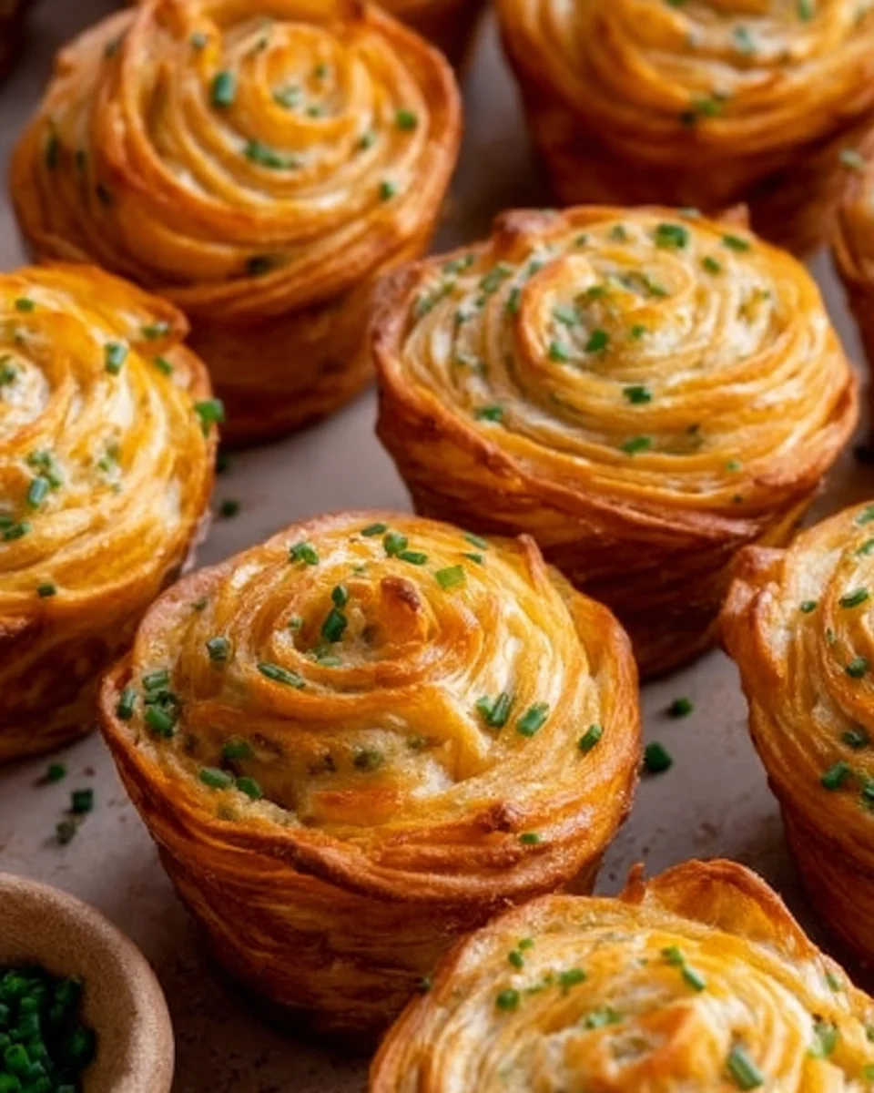 PrintCheesy Garlic Chive Cruffins are bite-sized crescent roll dough pastries filled with a rich cheesy chive garlic butter, rolled, sliced, and baked in a muffin tin, providing a crispy outside with a soft inside, perfect as an appetizer or side dish.