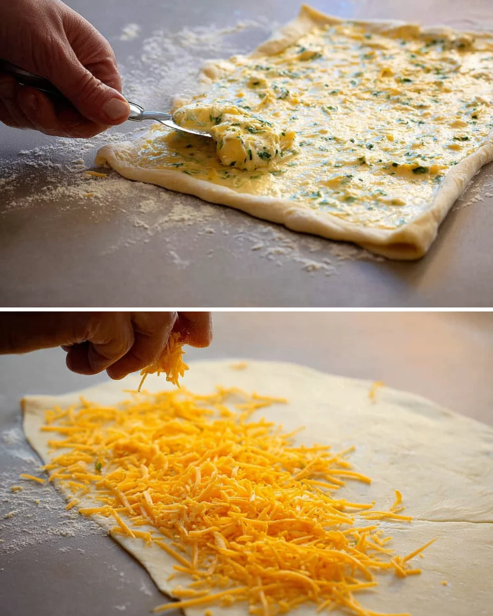 - Sprinkle 1 cup of shredded cheddar cheese evenly over the buttered dough sheet.