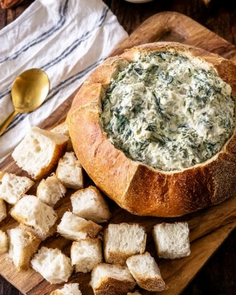 Use 10 ounces of frozen chopped spinach; thaw overnight in the fridge and squeeze out moisture for best results., Water chestnuts add a satisfying crunch but are optional., Serving in a bread bowl adds fun and flavor; a sturdy loaf like sourdough is recommended., Allow at least 2 hours resting time in fridge for flavors to develop; overnight is ideal., Make ahead up to 1-2 days; store in an airtight container and fill bread bowl just before serving., Serve with bread chunks, baguette slices, crackers, and fresh veggies like carrots, celery, and bell peppers., To warm, bake dip in bread bowl at 375°F for 15-20 minutes wrapped in foil., Leftovers keep well for up to 3 days refrigerated, best stored separately from bread bowl to prevent sogginess., Optional variations include adding minced garlic, chopped artichoke hearts, using Greek yogurt instead of sour cream for a lighter dip, or substituting water chestnuts with chopped celery.