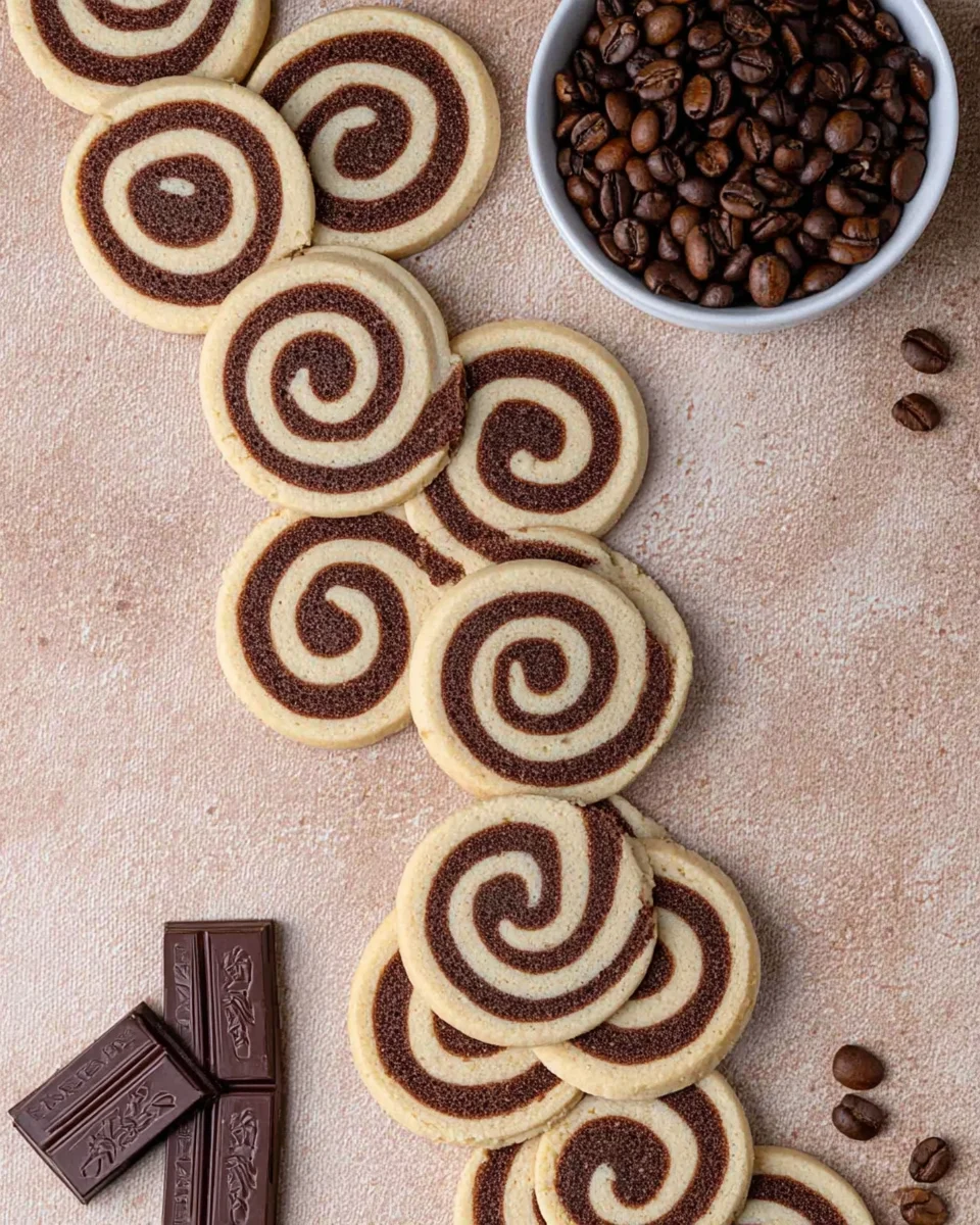 Delicious espresso chocolate pinwheel cookies featuring swirls of vanilla and chocolate espresso dough, crisp edges, and chewy centers – perfect for holiday treats or gifting.