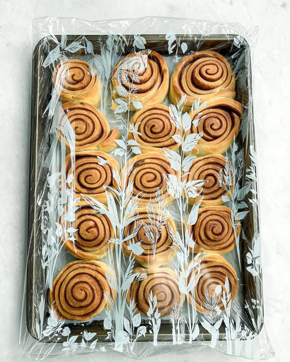 Arrange the rolls carefully in your prepared pan. Cover loosely with plastic wrap and let them rise in a warm spot until doubled in size, about 1 hour. If you’d rather bake these the next day, pop the pan with the covered rolls into the fridge. When ready to bake, bring them out and let sit at room temperature for an hour before baking.