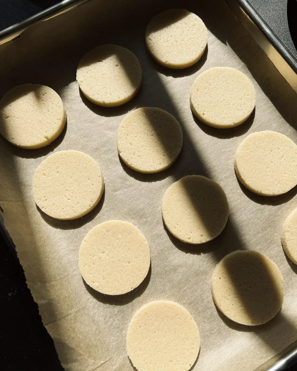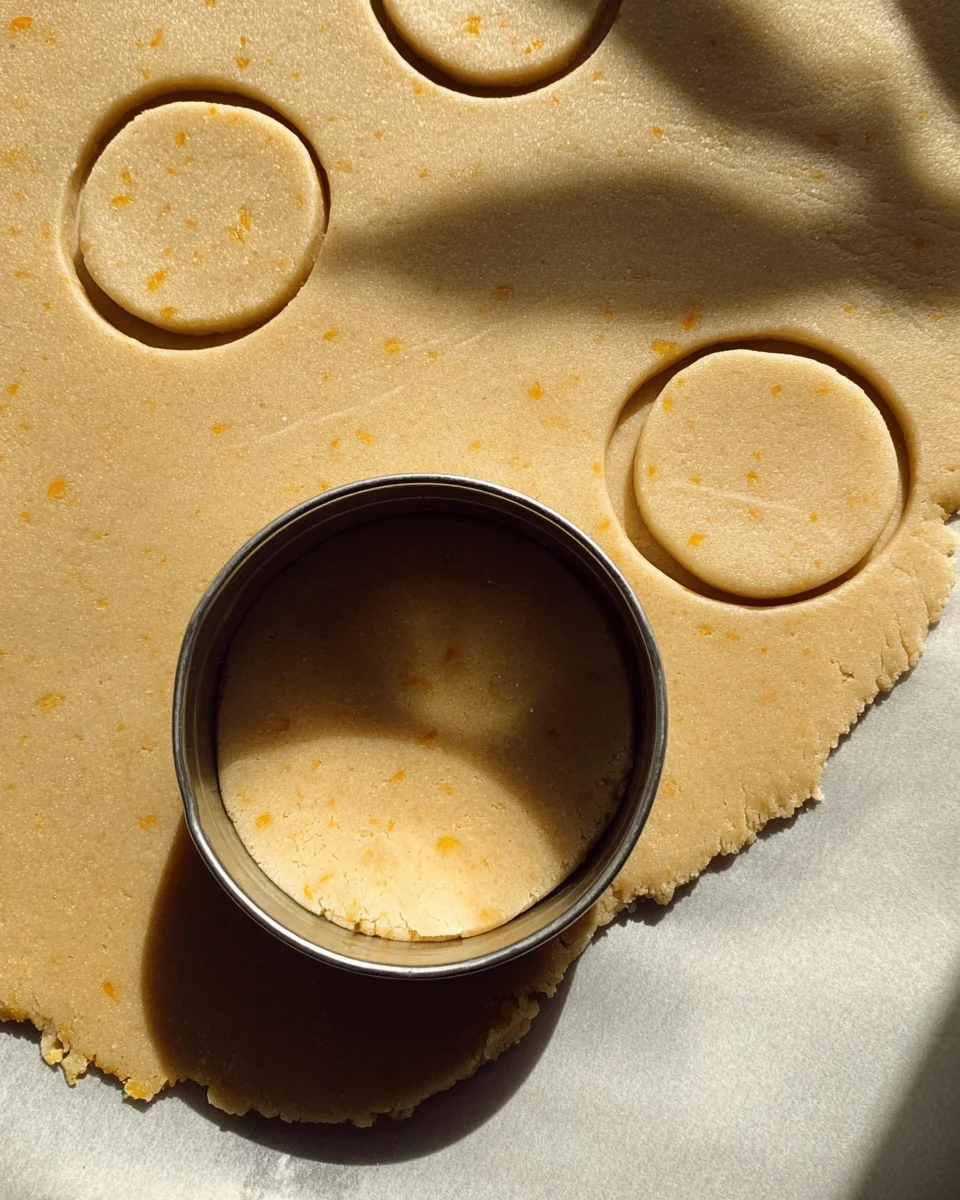 - Roll and cut shapes: place the dough between two sheets of parchment paper and roll it out evenly. Peel off the top sheet, then press cookie cutters into the dough for fun shapes or classic circles.
