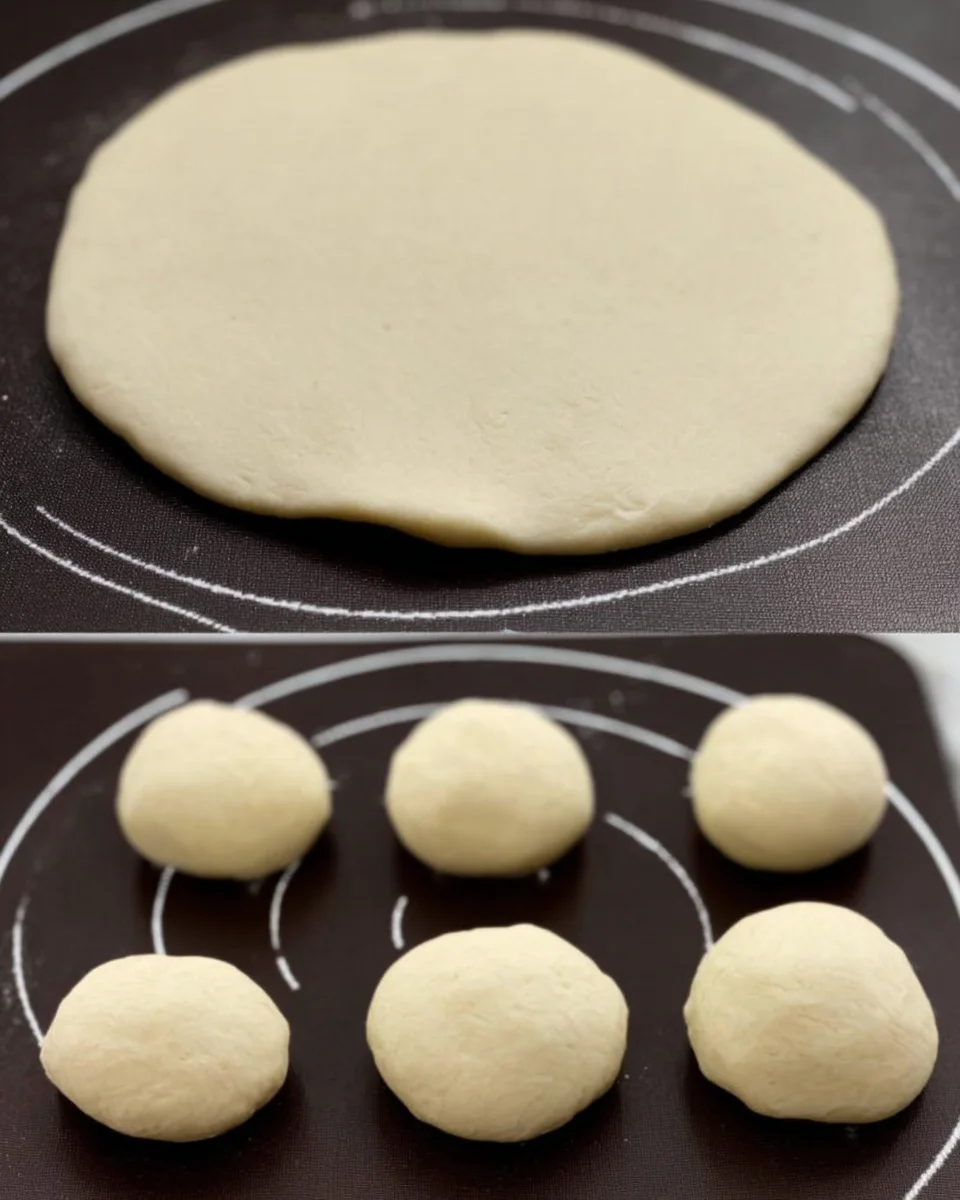 - Once risen, divide the dough into 6 equal pieces and roll each into a ball. Cover them loosely with plastic wrap to rest.