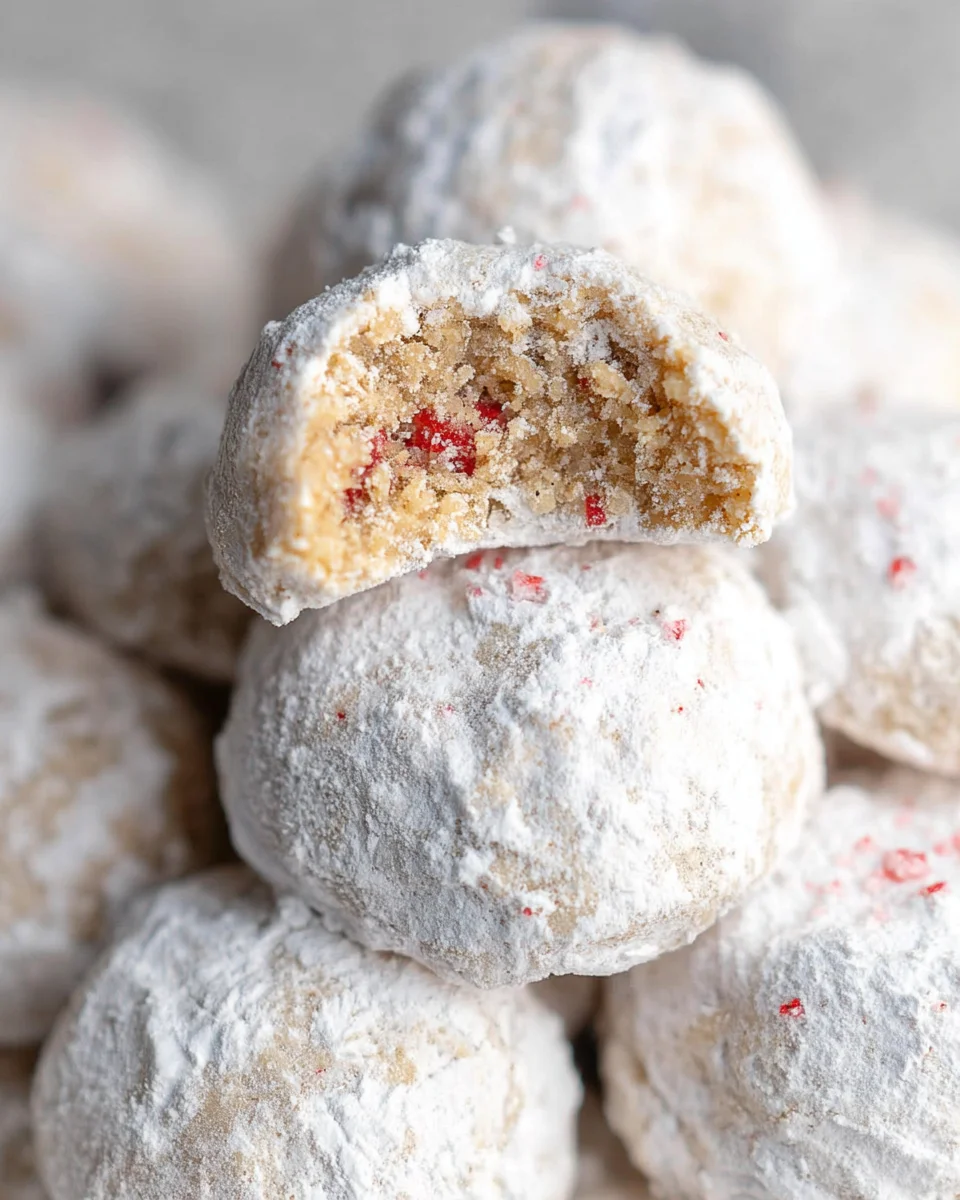 Buttery, tender peppermint snowball cookies with crushed candy canes and a powdered sugar coating, perfect for festive holiday treats.