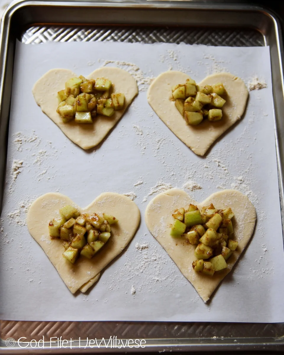 Line a baking sheet with parchment paper—these pre-cut parchment sheets are my favorite since they’re so easy to use and always fit perfectly. Then place your heart-shaped pastry cutouts on the sheet and fill each one with the apple mixture, leaving about half an inch border around the edges.