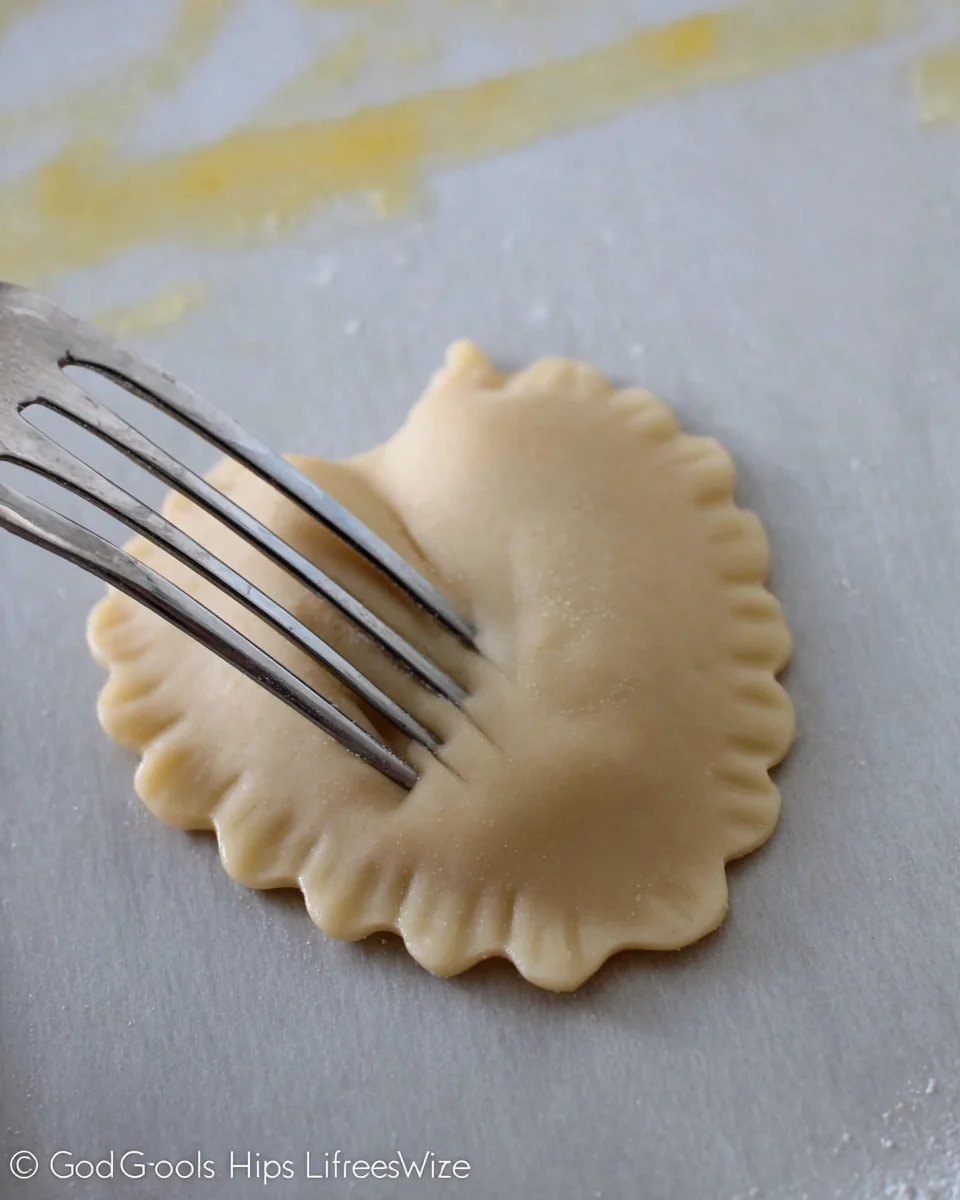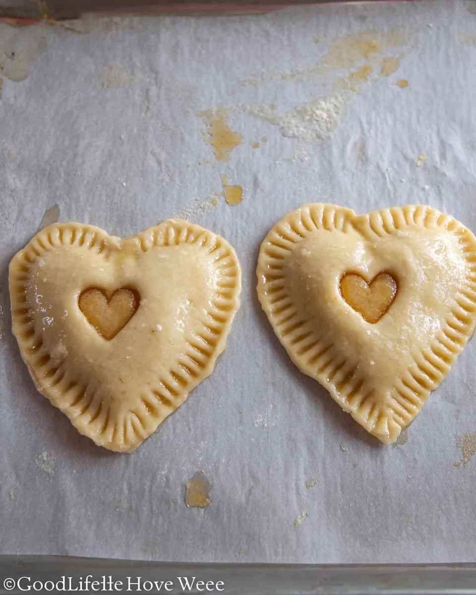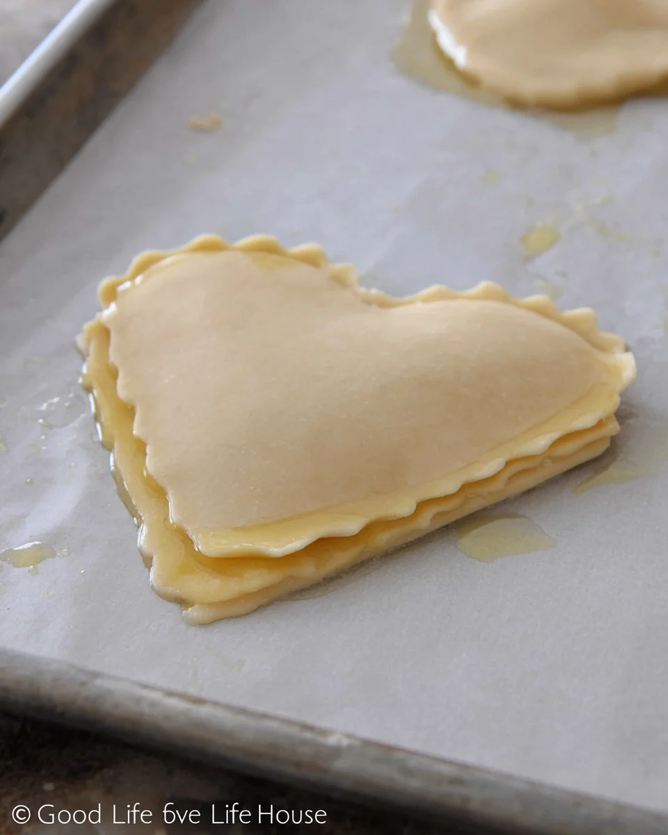 After brushing the edges, place another heart-shaped pastry on top and gently press down around the edges using a fork to crimp and seal the pie. This keeps the filling from escaping and adds a pretty decorative touch.