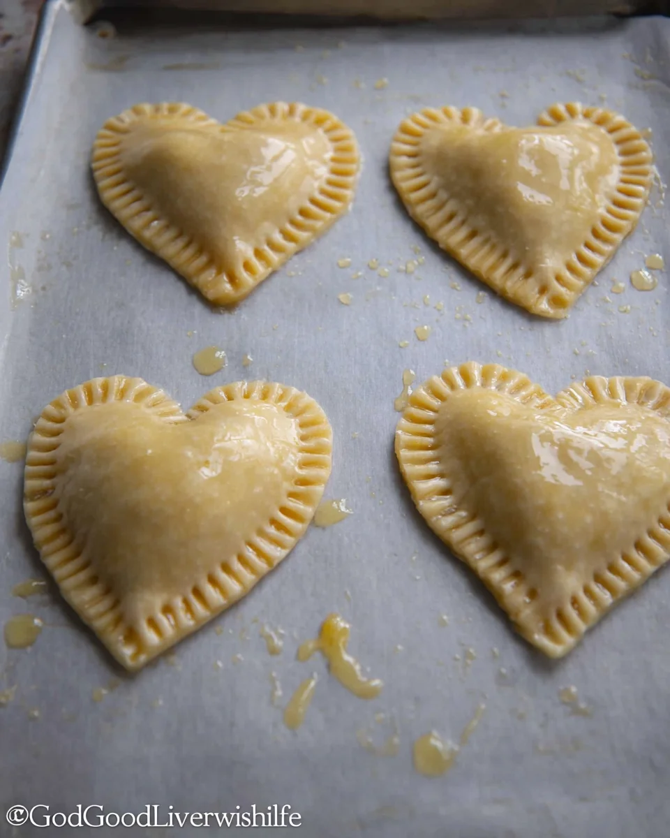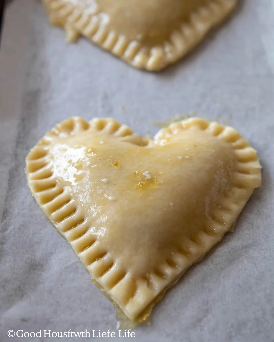 Beat an egg in a small bowl and brush it along the edges of your pastry hearts. This egg wash helps seal the pies and gives them a lovely golden color when baked.