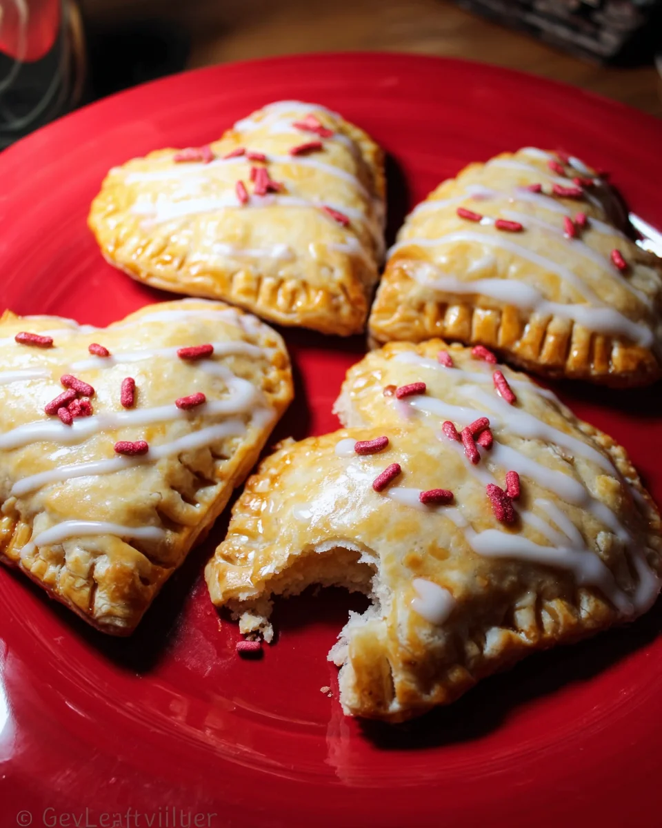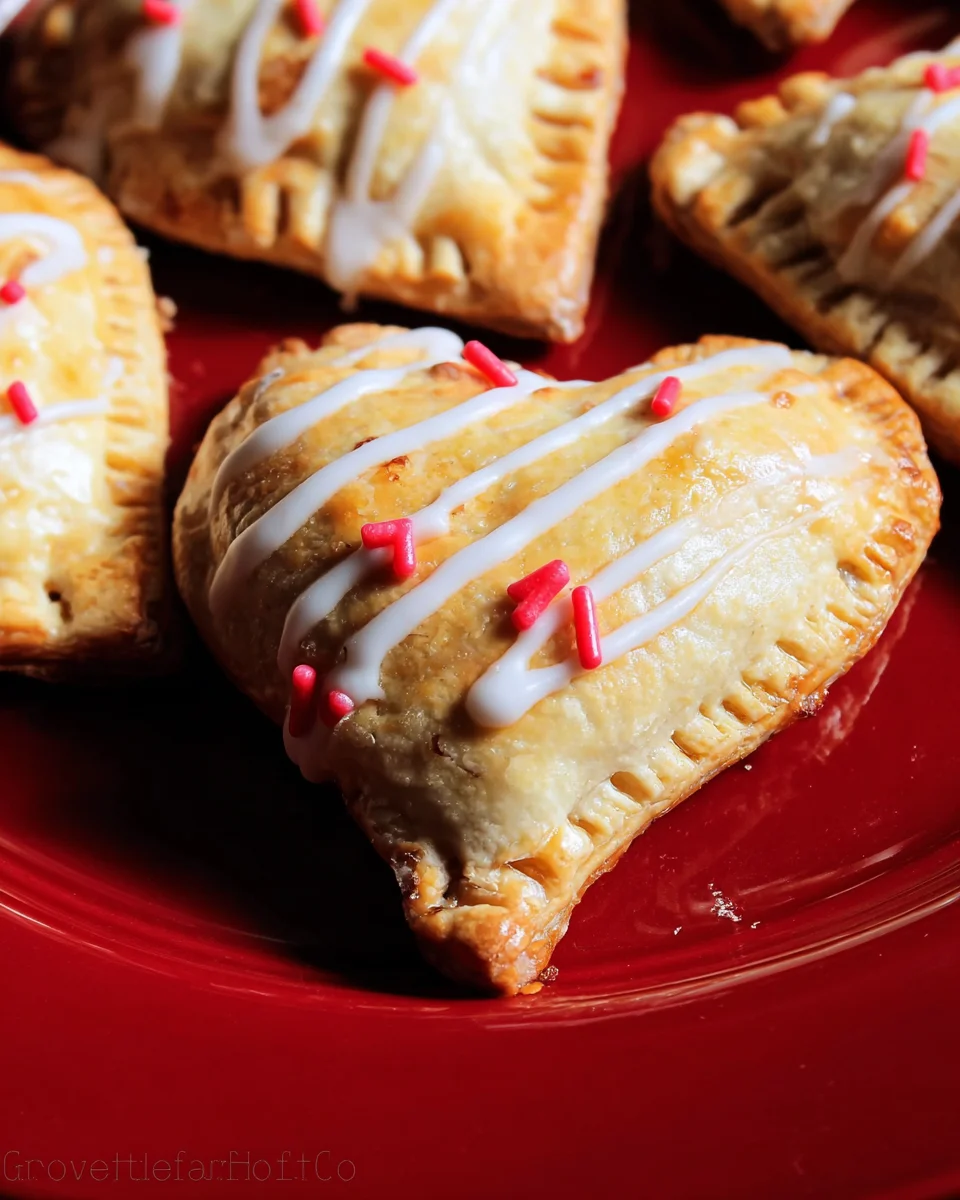 Valentine’s Day Mini Apple Pies with buttery, cinnamon-spiced apple filling enclosed in heart-shaped flaky puff pastry, topped with a sweet powdered sugar glaze and sprinkles.